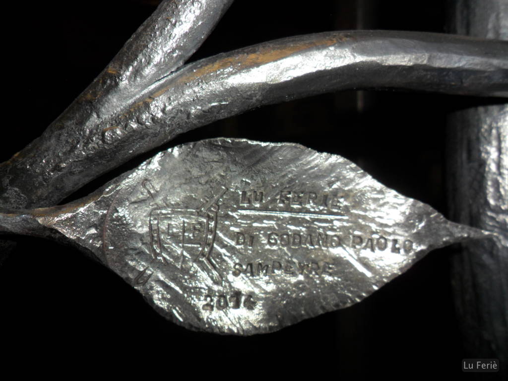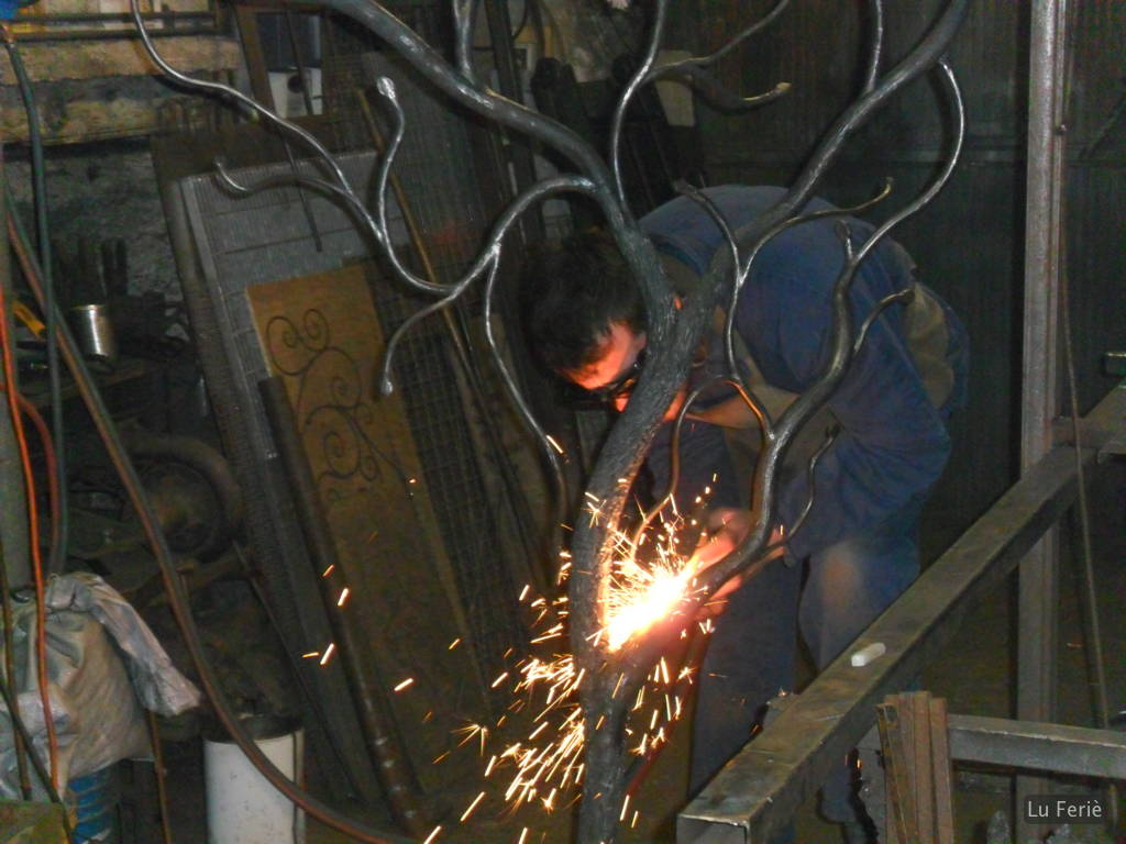 Ora, per non perdere la reputazione, “Lu Ferìe” è onorato di procedere, esponendo le tecniche applicate.Il tronco è stato realizzato con l’utilizzo di ferro tondo pieno scavato tramite fusione superficiale, in modo da ricreare nel modo più fedele possibile le autentiche venature della corteccia naturale. Attente osservazioni nei boschi locali hanno reso possibile lo sviluppo e la direzione dei rami, il tutto per riprodurre la natura facendola emergere direttamente dal ferro.Per non appesantire la struttura, si sono evitate le foglie prediligendo le gemme primaverili e piccole fioriture sui rami più alti, anch’esse realizzate interamente a mano. Come sempre le finizioni possono essere le più disparate e le più appetibili a seconda dei gusti e dei desideri dei richiedenti.Il fissaggio, sui tre punti degli appoggi disponibili, è realizzato senza l’utilizzo di staffe visibili, donando un carattere di mistero e pulizia strutturale.L’albero sembra nascere dal pavimento per continuare all’interno della volta a botte, donando luminosità e sicurezza alla scala, con il valore aggiunto di uno stile unico e firmato “Lu Ferìe”.